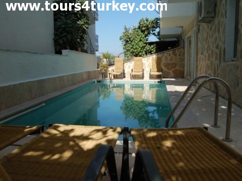 On the lovely terrace of Hideaway Hotel, you can enjoy the breathtaking view of the stunning Kas coastline, Gaze at the Greek Island of Kastellorizo (Meis) while sipping any one of the many hot or cold drinks served by the hotel. The town center is only five minutes by foot and the otogar (bus station), local market, beach and tombs are all within walking distance.