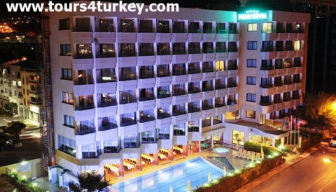 Palm Hotel is a luxury hotel located in Kusadasi, next to the yacht harbour. Palm Hotel offers views overlooking a beach, the Aegean Sea and Kuşadası Marina. It lies about 5 minutes on foot from the many beautiful cool shops and a minute walk from the public beach. In spite of the location to the street, you have no disturbance in the hotel itself from the car traffic. On the contrary, you could walk quietly to the top of the market which sold clothing.
